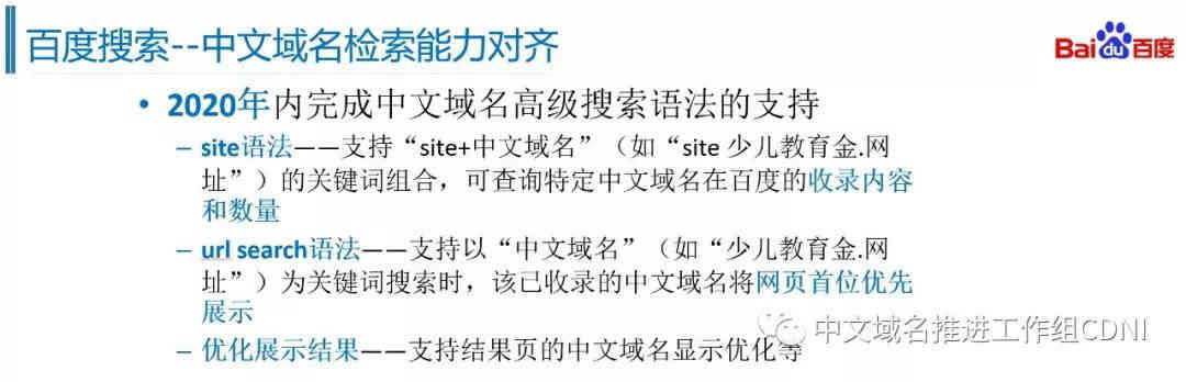 中文域名用户注册的初衷是助力网站的推广。百度作为最大的中文搜索引擎,对中文域名收录,绝对是个对中文域名用户利好的大消息。2020年,百度搜索将更近一步,实现中文域名搜索优化。按照李明华的说法,叫“中文域名检索能力对齐”。